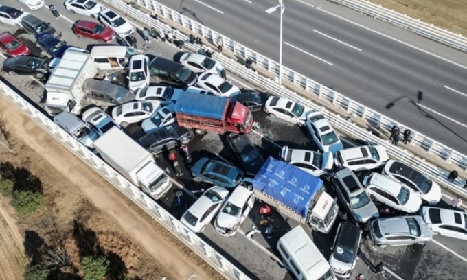 Vụ tai nạn xảy ra ở thành phố Trịnh Châu, tỉnh Hà Nam, miền trung Trung Quốc. Ảnh chụp từ trên cao cho thấy hàng loạt xe hơi, xe tải, xe khách đâm vào nhau một đoạn dài, chất thành đống, tạo ra khung cảnh hỗn loạn. Theo truyền thông, tai nạn xảy ra do tầm nhìn kém vì sương mù dày đặc.