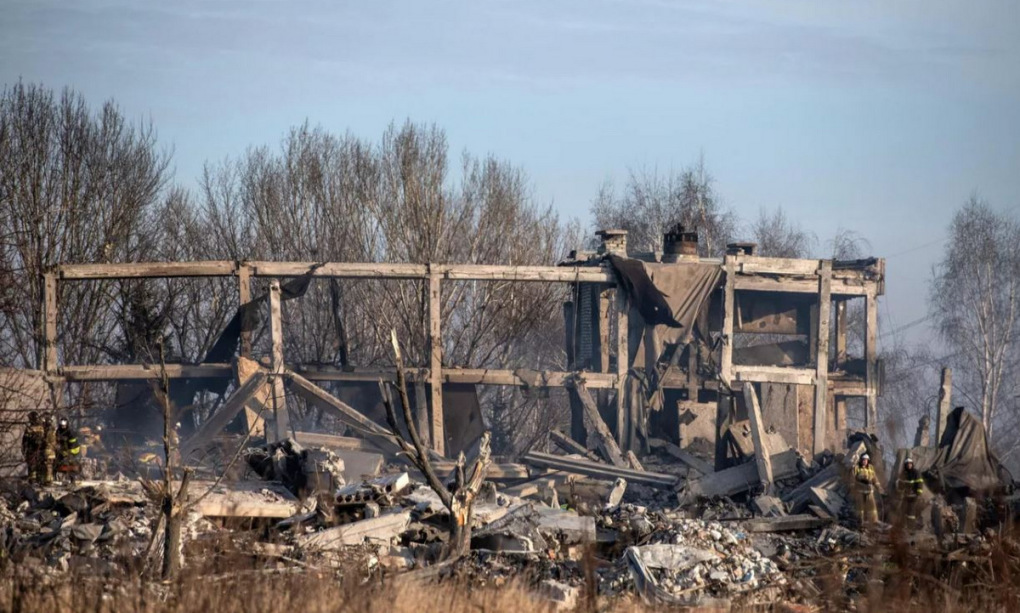 Hình ảnh được truyền thông Nga công bố cho thấy đống đổ nát tại tòa nhà của một trường cao đẳng nghề ở thành phố công nghiệp Makiivka thuộc tỉnh Donetsk.
