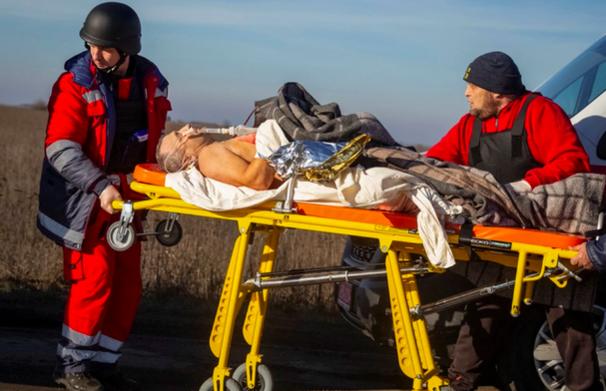 Nhân viên y tế sơ tán người dân bị thương trong cuộc tấn công của quân đội Nga ở Berislav tại vùng Kherson, Ukraine ngày 2-1-2023 - Ảnh: REUTERS