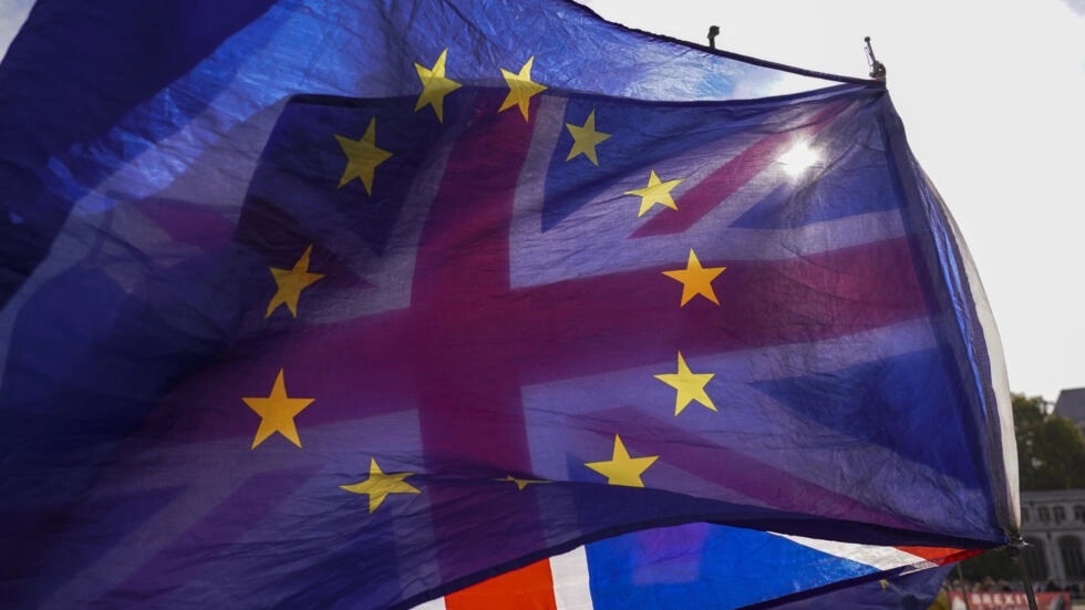 Cờ Anh Quốc và cờ Liên Hiệp Châu Âu bên ngoài Nghị Viện Anh, Luân Đôn, Anh Quốc, ngày 19/10/2022. AP - Alberto Pezzali