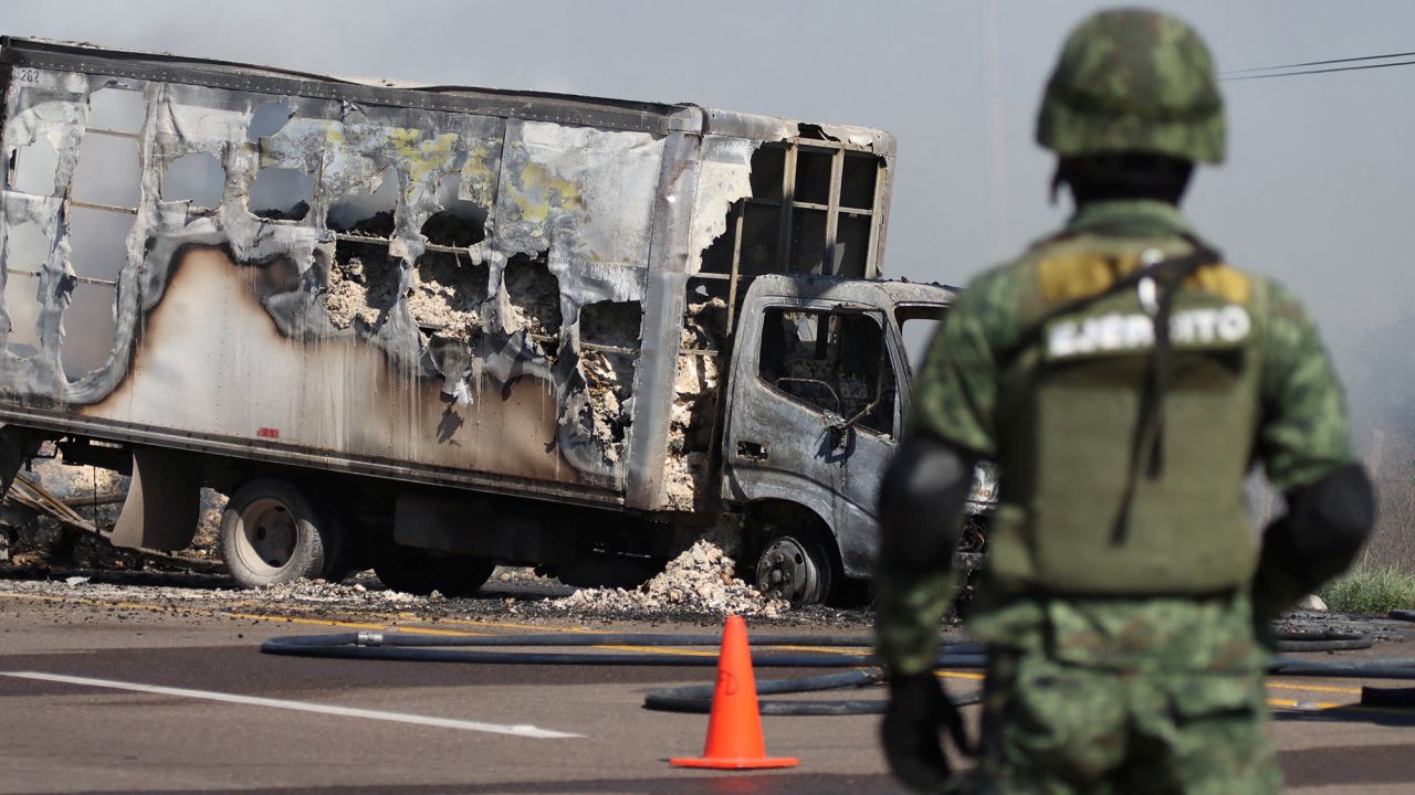 Một chiếc xe chở hàng cháy rụi sau cuộc đụng độ giữa lực lượng liên bang Mexico và băng đảng ma túy vũ trang ở thành phố Culiacán. Ảnh: EPA