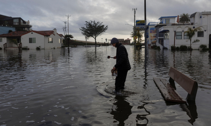 Người dân trên tuyến phố bị ngập ở thị trấn Aptos, miền bắc bang California của Mỹ, hôm 5/1. Ảnh: Reuters.