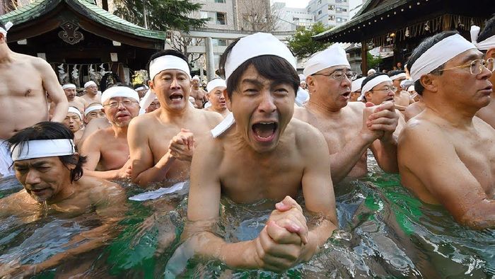 Nhiều người dân Nhật Bản đã tề tựu tại ngôi đền Thần Đạo (Teppo-zu Inari) ở Tokyo, cùng nhau tắm nước đá. Nghi thức Kanchu Suiyoku này được xem là để thanh tẩy tâm hồn, cầu mong sức khỏe và nhiều điều may mắn trong năm mới.