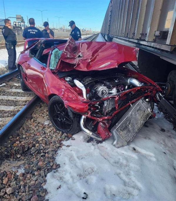Chiếc Toyota Supra rú ga vọt lên rồi trượt bánh, ngoặt sang trái trước khi lao sang phải về phía đường tàu, hôm 9/1 ở Englewood, bang Colorado.