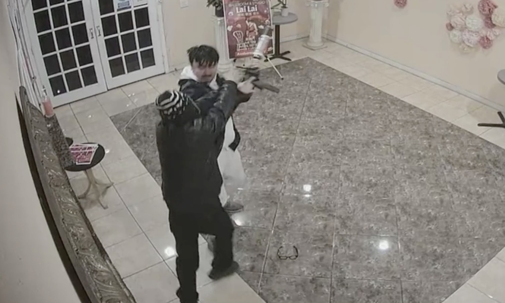Khoảnh khắc Brandon Tsay giằng co với nghi phạm Huu Can Tran và tước thành công khẩu súng từ tay người này tại câu lạc bộ đêm Lai Lai ở Alhambra, California, hôm 21/1. Ảnh: NBC.