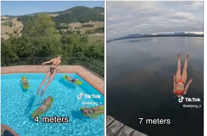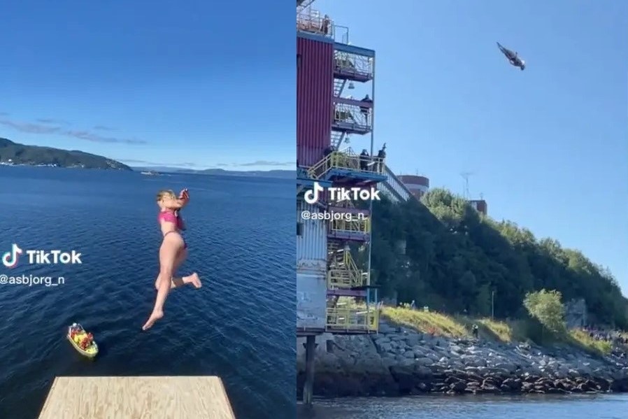 Trong video được đăng tải ngày 24/1 trên kênh TikTok của Asbjorg Nesje, có thể thấy cô gái khoảng 20 tuổi đang đứng trên một tấm ván cách mặt nước rất cao, sau đó phóng mình ra không trung, lao tự do xuống nước.