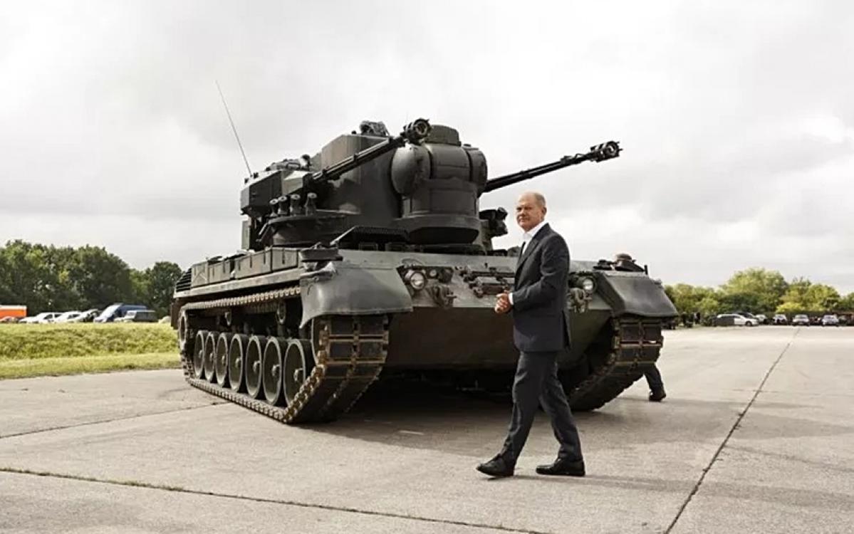 Thủ tướng Đức Scholz đứng trước pháo tự hành phòng không Gepard. Ảnh: Getty.