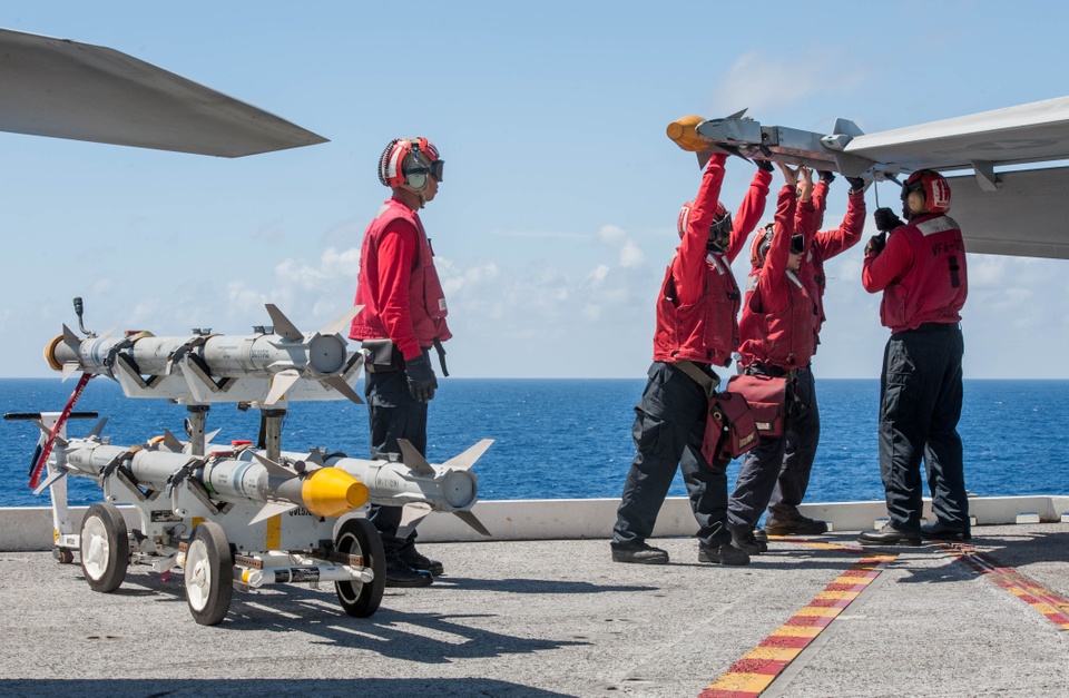 Lính Mỹ lắp tên lửa AIM-9X lên tiêm kích F/A-18F trên tàu sân bay USS Ronald Reagan. Ảnh: Hải quân Mỹ.