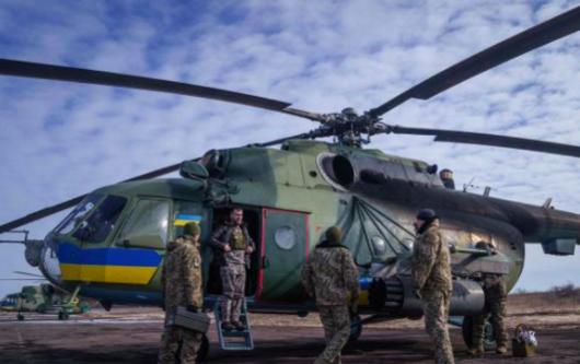 Các thành viên phi hành đoàn trực thăng của Lữ đoàn Hàng không Quân đội Riêng biệt số 18 chuẩn bị trước khi cất cánh, ở miền đông Ukraine vào ngày 9 tháng 2 năm 2023. Ảnh Getty