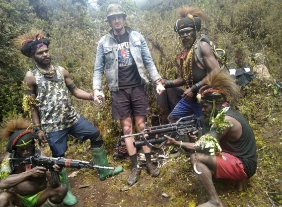 Phiến quân ly khai ở Indonesia chụp ảnh với một người đàn ông mà họ nói là phi công New Zealand Phillip Mark Mehrtens tại một địa điểm không được tiết lộ ở tỉnh Papua, Indonesia. Ảnh Quân Giải phóng Tây Papua/AP