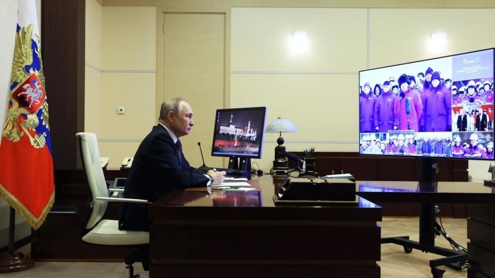 Từ dinh thự Novo-Ogaryovo, ngoại ô Matxcơva, ngày 17/02/2023, tổng thống Nga Vladimir Putin tham dự trực tuyến một sự kiện đánh dấu 30 năm thành lập tập đoàn năng lượng quốc gia Gazprom. AP - Mikhail Metzel