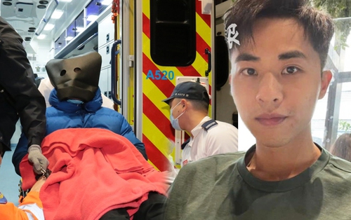 Alex Kwong mặc áo khoác xanh, quần đen, đầu trùm kín. Nghi phạm nằm trên cáng và được cảnh sát đưa đến bệnh viện - Ảnh: HK01