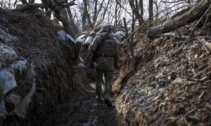 Lính Ukraine trong chiến hào ở thị trấn Horlivka tại tỉnh Donetsk hôm 3/3. Ảnh: Reuters.