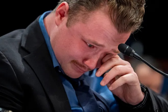 Cựu trung sĩ Tyler Vargas-Andrews khóc khi làm chứng trước Hạ viện Mỹ hôm 8/3. Ảnh: AP.