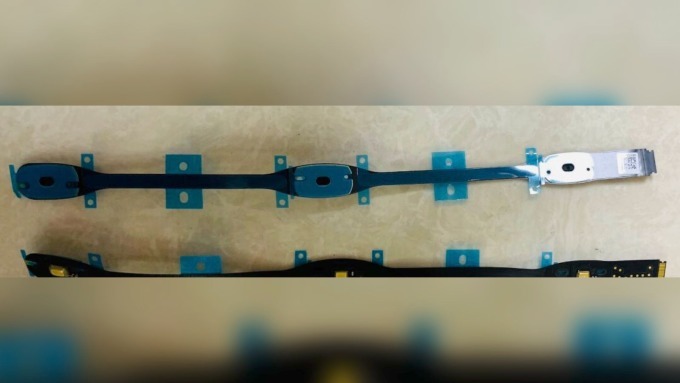 Trong ảnh là hai sợi cáp với hình dạng gọng kính bao quanh mắt, có thể dùng để kết nối những thành phần quan trọng là màn hình và bảng mạch. Trong khi đó, linh kiện còn lại giống một dãy ba cảm biến, hoặc camera, cùng với một cáp kết nối khác.