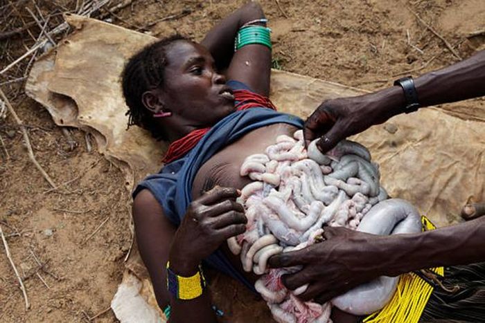 Một phụ nữ được phù thủy đắp bộ ruột trâu lên bụng để lấy hết chất độc do bị người khác hãm hại.