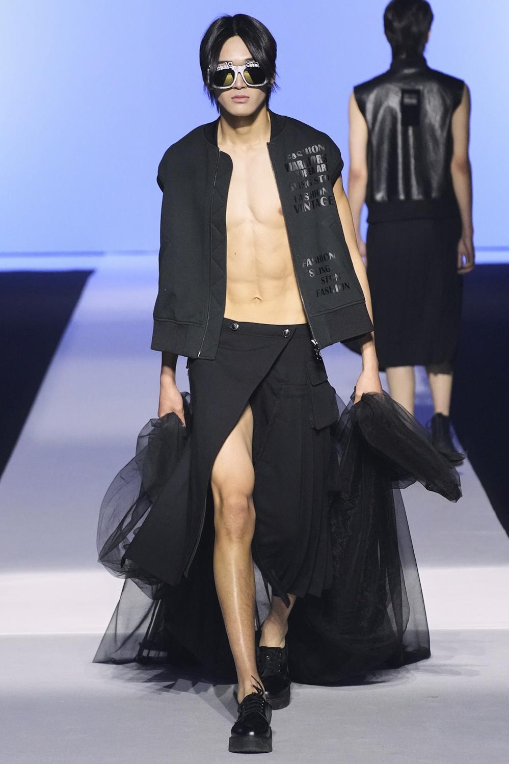Người mẫu nam mặc váy, khoe ngực tại Tuần lễ thời trang Seoul. Gần một nửa người mẫu nam diện váy áo khoe ngực trần, cơ bắp tại buổi trình diễn của thương hiệu Sling Stone trong khuôn khổ Tuần lễ thời trang Seoul 2023.