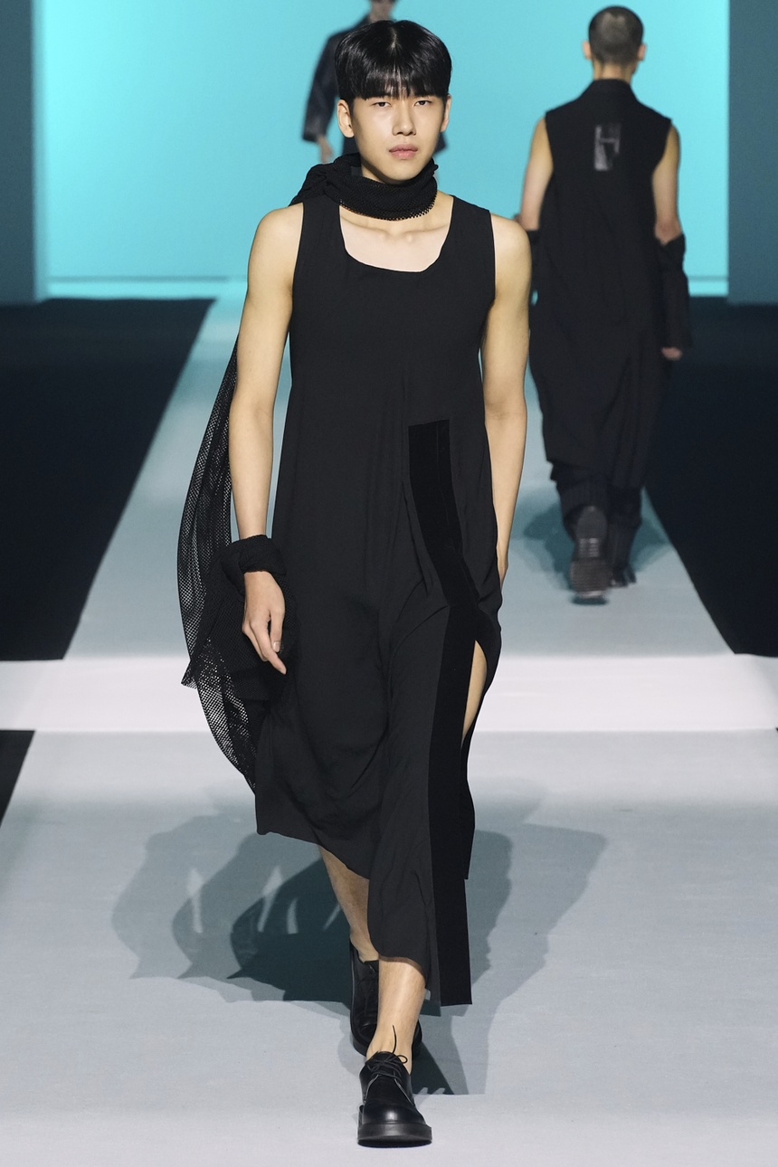 Gấu quần được biến tấu thành găng tay, chân váy xẻ tà được người mẫu nam trình diễn là điểm nhấn của bộ sưu tập. Ảnh: Seoul Fashion Week.