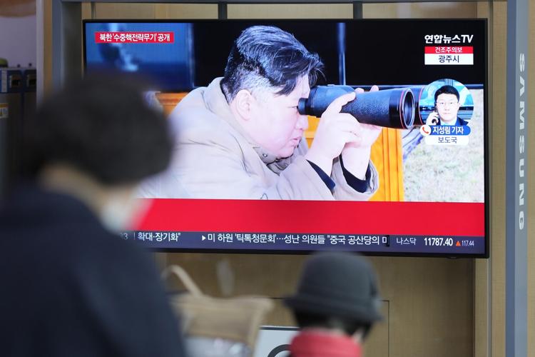 Màn hình TV tại Nhà ga Seoul ngày 24/3/2023 cho thấy Chủ tịch Triều Tiên Kim Jong-un đang quan sát qua ống nhòm. Ảnh: AP