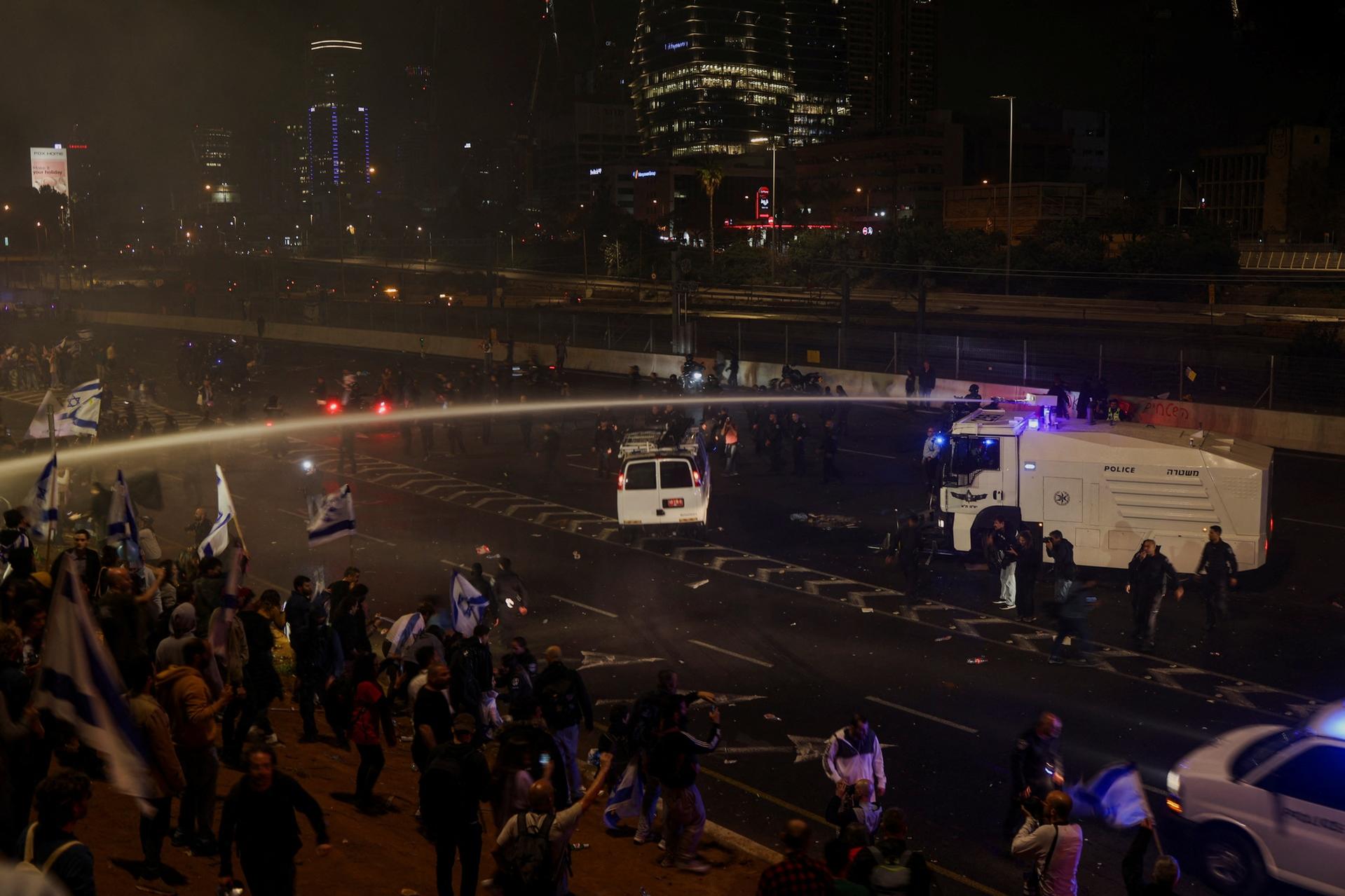 Cảnh sát Israel dùng vòi rồng giải tán người biểu tình. Ảnh: Reuters.