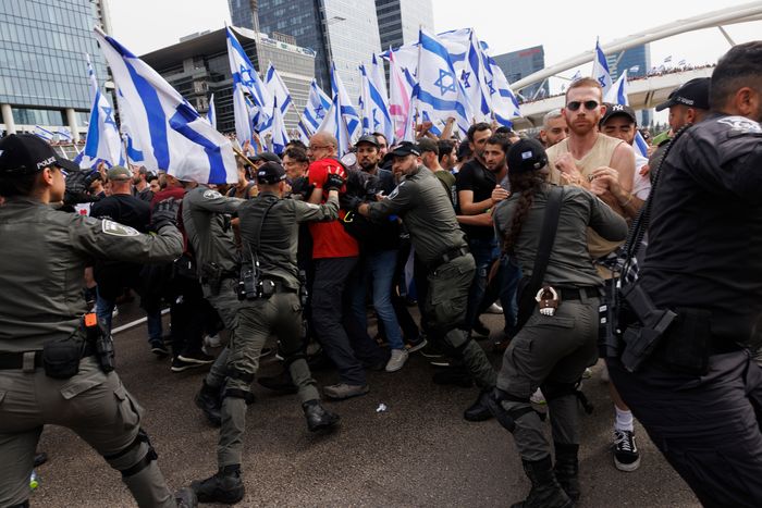 Lực lượng Israel ngăn cản những người biểu tình ngày 27/3. Ảnh: WSJ