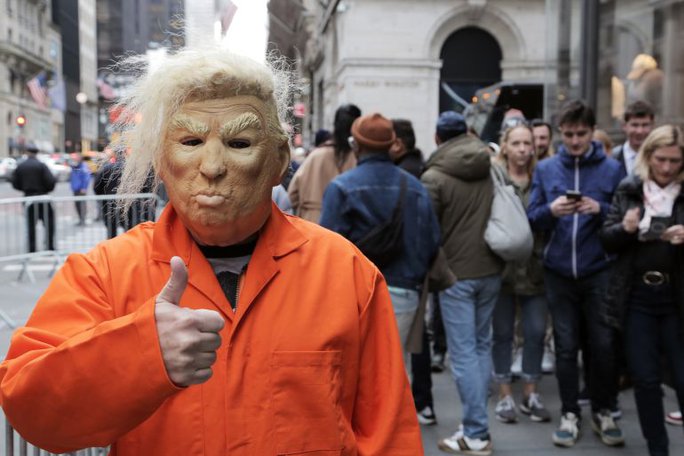 Một người biểu tình đeo mặt nạ giống khuôn mặt ông Trump đứng trước Toà nhà Trump Tower hôm 3-4. Ảnh: Al Jazeera