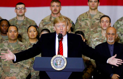 Ông Donald Trump phát biểu trước quân đội Mỹ, với Tổng thống Afghanistan Ashraf Ghani đứng phía sau, trong chuyến thăm không báo trước tới Căn cứ Không quân Bagram (Afghanistan) ngày 28-11-2019, khi ông Trump là tổng thống Mỹ đương nhiệm - Ảnh: REUTERS