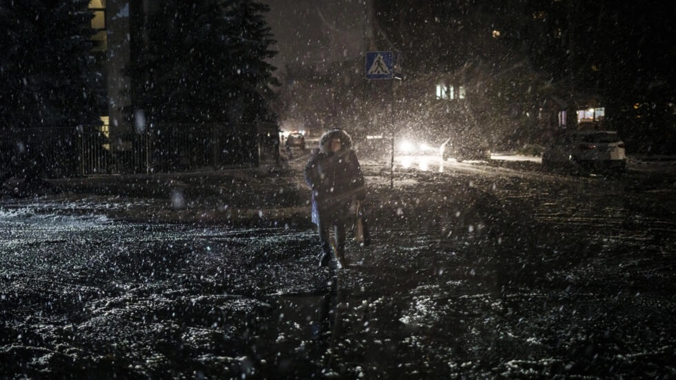 Ảnh minh họa : Tuyết rơi xuống thành phố Kiev (Ukraina) tối 16/12/2022, vào lúc tình trạng mất điện tiếp tục diễn ra do oanh kích của Nga. AP - Felipe Dana