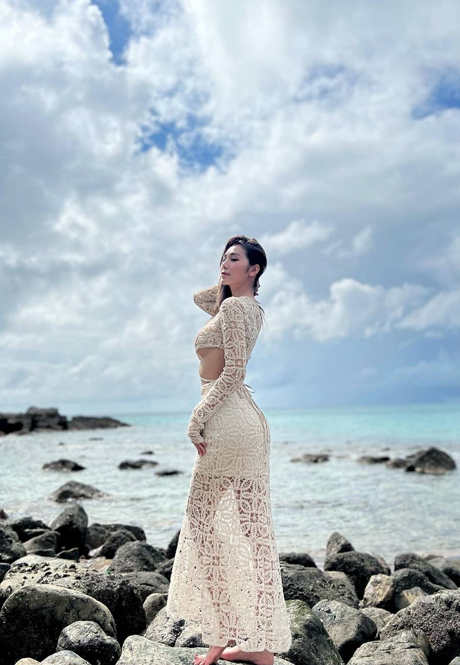 Với Hoàng Kim Chi, cô chọn trang phục màu trắng dáng dài. Thiết kế có phần lớp lót bên trong, nhưng tà váy xuyên thấu từ đùi tới gót chân để tăng thêm sức hút. Chi tiết đắt giá thuộc về điểm cut out khoét rộng kéo dài từ chân ngực tới vòng eo. Nhờ vậy, nữ giám đốc quê Quảng Trị có được những khoảnh khắc khoe dáng đẹp như nữ thần trên biển.