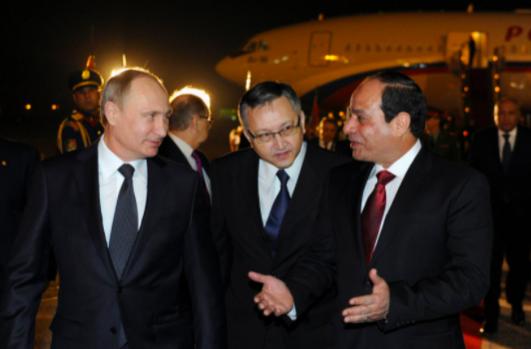 Tổng thống Ai Cập Abdel Fattah al-Sisi (phía trước bên phải) nói chuyện với Tổng thống Nga Vladimir Putin (phía trước bên trái) trong buổi lễ chào đón khi ông Putin đến Sân bay Quốc tế Cairo, ngày 9 /2/ 2015.