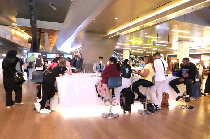 Hành khách ngồi ở khu trại tại sân bay Hamad (Qatar) trong lúc đợi quá cảnh. Ảnh: NVCC