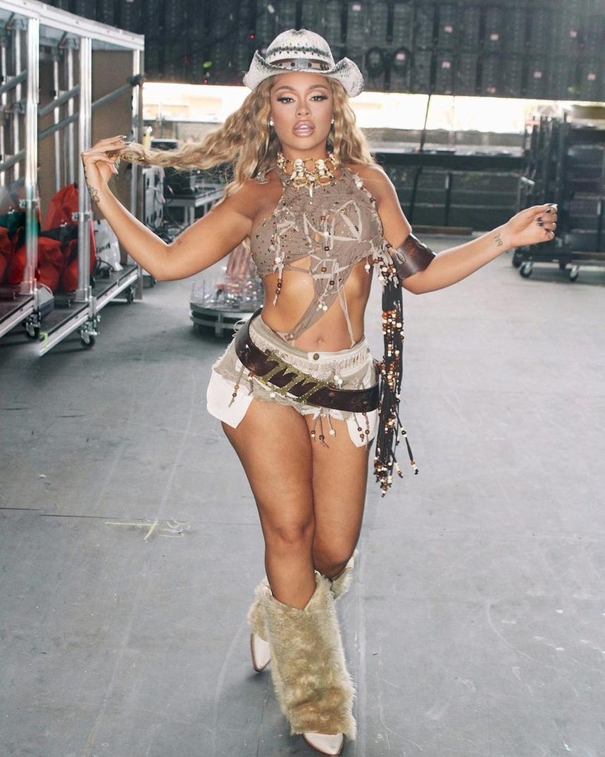Khi xuất hiện trên sân khấu Coachella 2023, Latto gây chú ý với khán giả nhờ trang phục biểu diễn hở bạo. Cô diện bộ bodysuit cut-out màu nâu sẫm cùng chiếc quần short 5 cm.