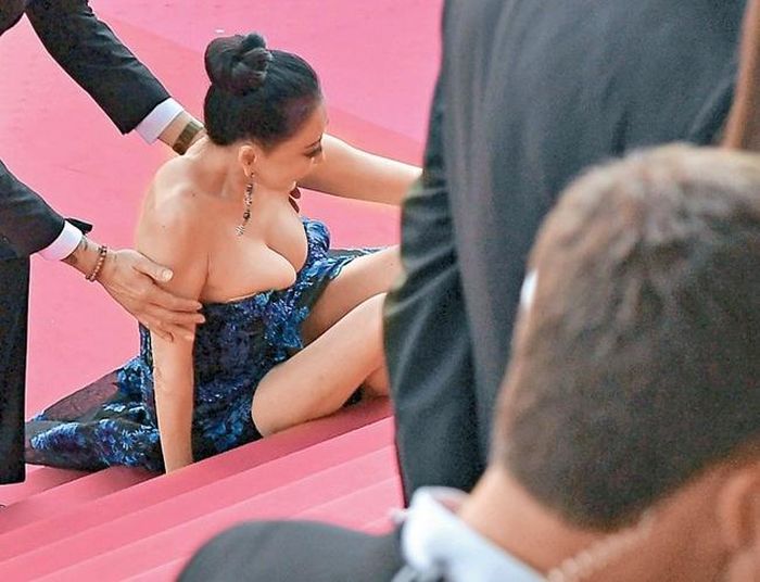 Vờ té ngã, lộ hàng và mặc hở hang là chiêu trò gây chú ý của sao Trung kém tên tuổi ở Cannes. Ảnh: Sina.