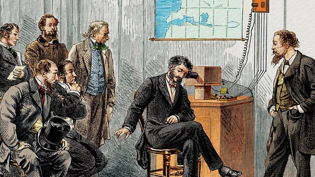 Nhà bác học Alexander Graham Bell trong buổi thử nghiệm chiếc điện thoại vào năm 1877.