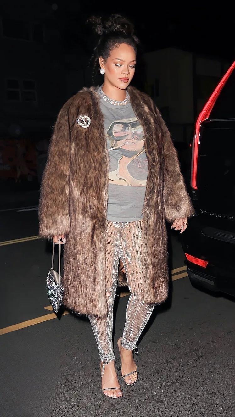 Rihanna diện quần trong suốt, lấp lánh khi xuất hiện trên đường phố để dùng bữa tối cùng bạn bè. Ảnh: BackGrid.