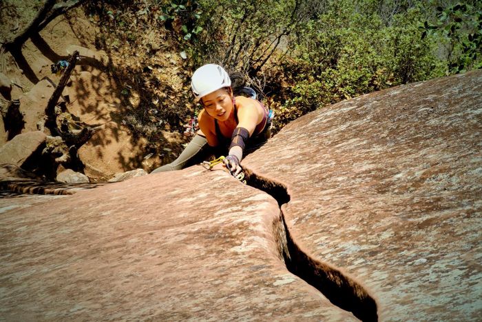 Tay và chân của Wong kẹt chặt giữa vết nứt có chiều rộng 7-30 cm, cô dựa vào lực để bám vào mặt đá trơ trọi. Cứ vài mét, cô dừng lại để đẩy một thiết bị kim loại vào vết nứt, kẹp dây và tiếp tục leo lên.