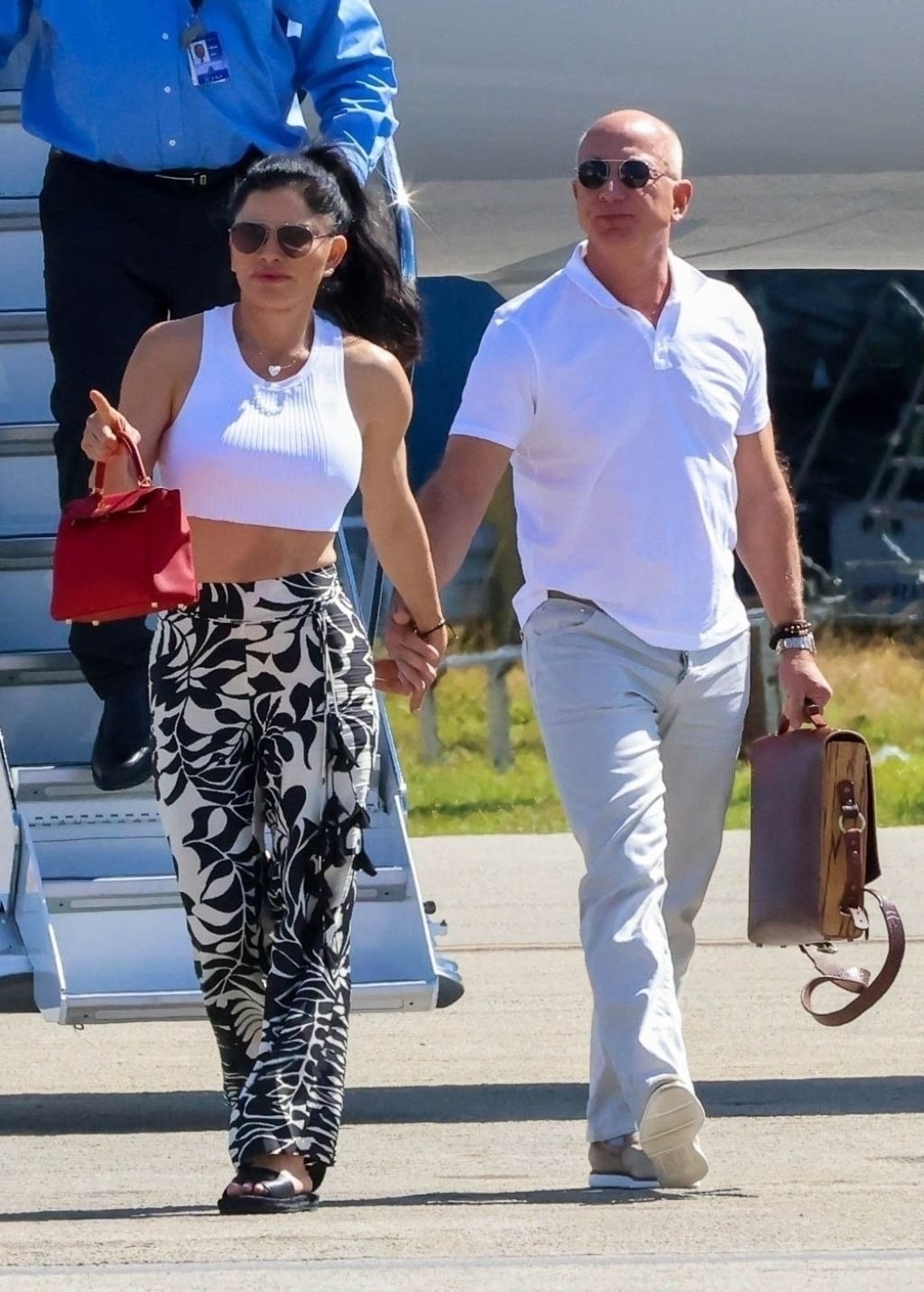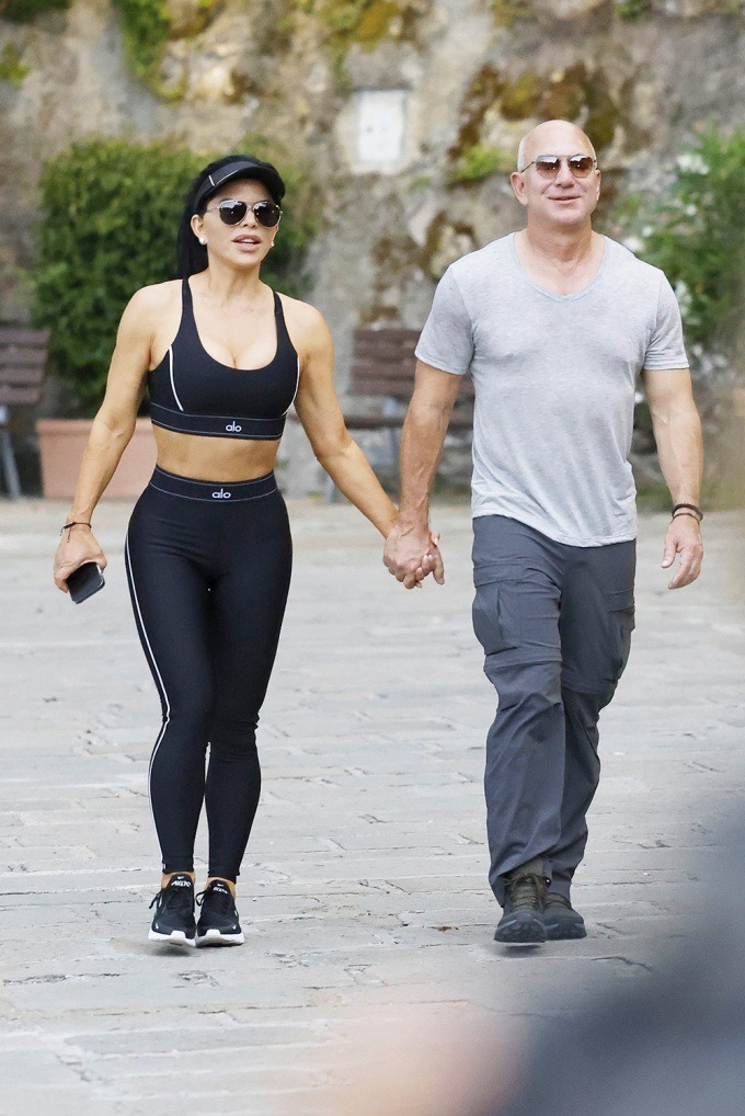 Hồi tháng 6, Jeff Bezos và Lauren Sanchez đi nghỉ ở Portofino, Itlay. Trong khi Bezos theo mốt quần cargo đang hot, vợ sắp cưới của ông chọn phong cách athleisure - mặc đồ tập như trang phục thường - với crop top và quần legging. Ảnh: SplashNews