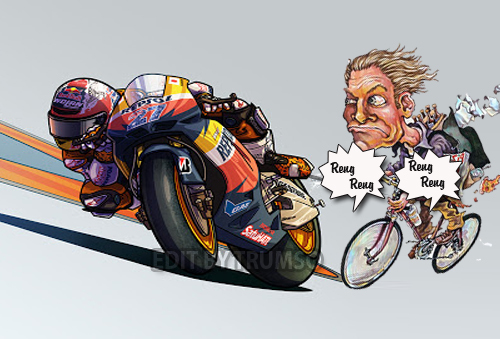 Vừa đi được một đoạn thì có một chiếc môtô khác qua mặt, anh này tức chí bèn nhấn ga vượt lên thế là hai gã đua với nhau quên mất anh chàng vận động viên xe đạp tội nghiệp.