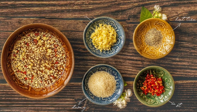 Thơ Thơ cho biết với những loại nước chấm có tỏi băm, cần băm thật nhỏ trên thớt khô, dao khô không bị thấm nước. Tỏi ớt cho vào sau cùng, khi nào chuẩn bị ăn, để lâu tỏi ngậm nước sẽ chìm xuống. Bạn pha theo thứ tự: Đường, nước, chanh rồi hòa tan, sau đó cho mắm và tỏi ớt băm.