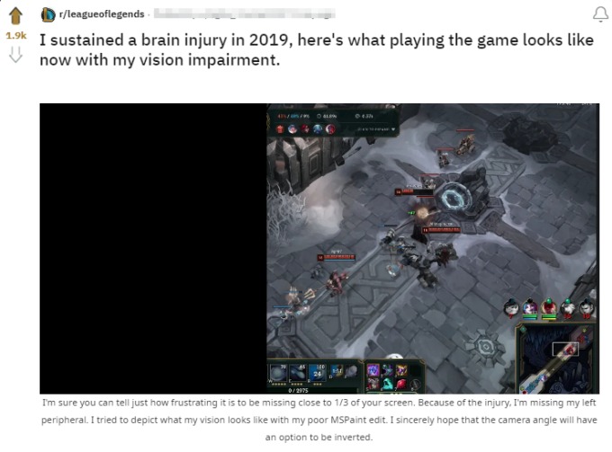 Theo những gì chia sẻ, anh chàng bị chấn thương sọ não vào năm 2019 và phải trải qua quá trình điều trị khó khăn. Dù đã phục hồi, song thị lực vốn có đã bị suy giảm đáng kể. Hiện tại, game thủ này hoàn toàn mất một phần ba tầm nhìn. Nếu chơi game, anh ta sẽ không thể thấy được khu vực bên trái của bản đồ.