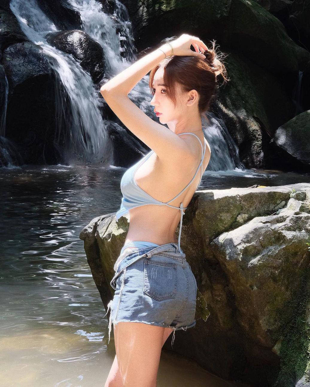 Old  Default Người đẹp khéo diện áo yếm, quần short tắm suối tôn da trắng phát sáng