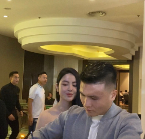 Ở bàn lễ tân bên ngoài hội trường cưới của Đoàn Văn Hậu và Doãn Hải My, Quang Hải đã chủ động chào hỏi, trò chuyện với các cầu thủ đình đám. Còn Chu Thanh Huyền nắm chặt tay con gái đại gia Minh Nhựa, Joyce Phạm. Sau khi chào hỏi huấn luyện viên Park Hang Seo, nam cầu thủ mới chủ động nắm tay bạn gái để ra bàn lễ tân viết phong bì mừng cưới Đoàn Văn Hậu.