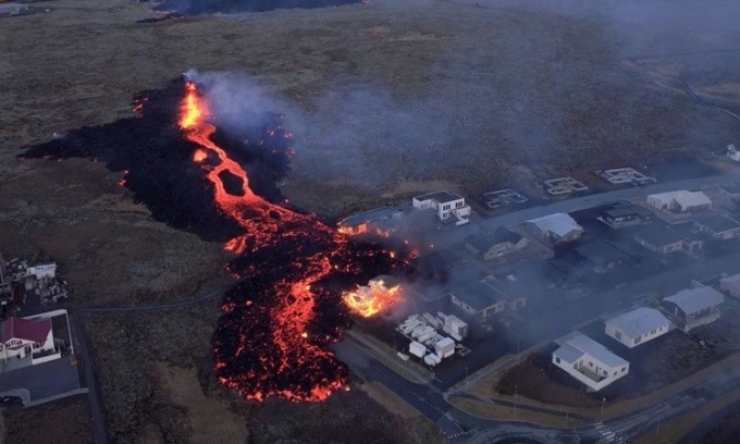 Dung nham chảy từ núi lửa khiến nhà cửa ở Grindavik bốc cháy hôm 14/1. Ảnh: Bjorn Steinbekk