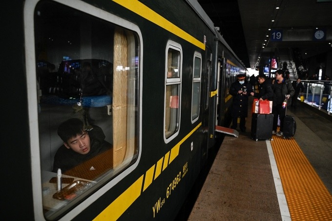 Hành khách lên tàu tại nhà ga thành phố Thạch Gia Trang, tỉnh Hà Bắc, Trung Quốc ngày 6/2. Ảnh: AFP