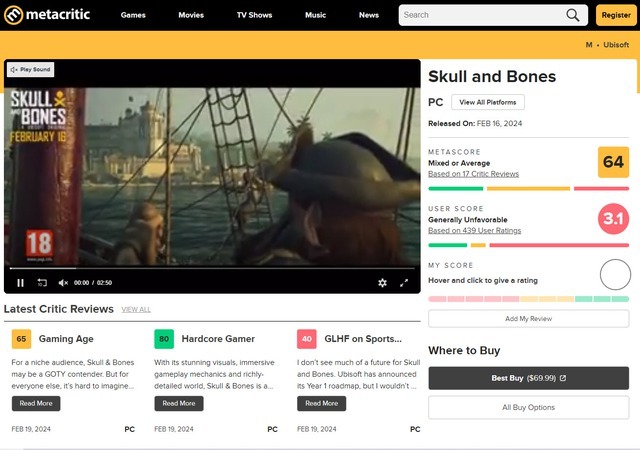 Theo TechSpot, tựa game cướp biển Skull and Bones được Ubisoft ‘cưng như trứng’ với quy mô AAA và giá bán đến 70 USD đã có khởi đầu không mấy suôn sẻ. Theo đó, trò chơi hiện đang nắm giữ danh hiệu game có điểm đánh giá người dùng thấp nhất trên Metacritic trong năm 2024. Ngay cả Suicide Squad: Kill the Justice League, tựa game bị mọi người không ngớt chê bai, cũng có điểm cao hơn trò chơi mất cả thập kỷ để phát triển này.