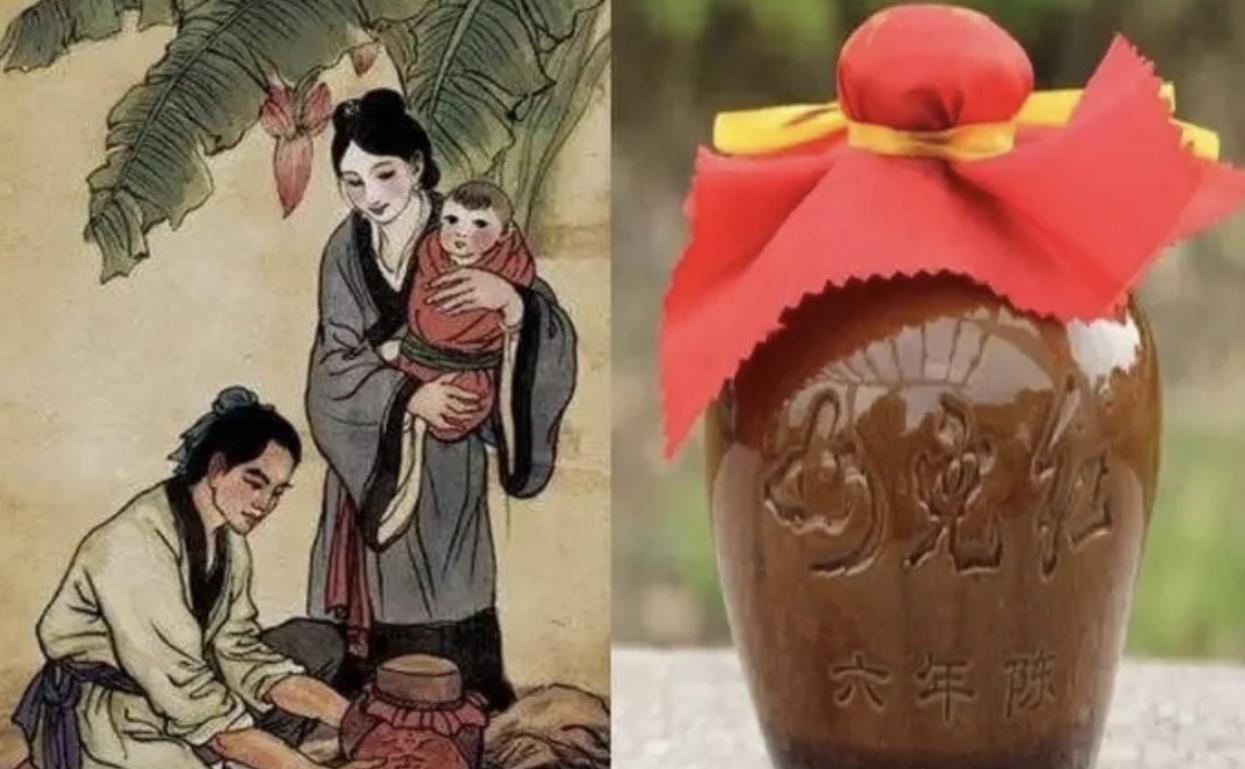 Ở Trung Quốc, câu chuyện về "nữ nhi tửu" được lưu truyền từ nhiều đời như sau: Vào thời Tống, có một người thợ may lành nghề ở Thiệu Hưng (Chiết Giang) khi biết tin vợ mang thai đă rất mừng, hy vọng đứa bé sẽ là con trai để nối nghiệp ḿnh. Anh liền thuê người nấu hai chục hũ rượu nếp to, để dành cho ngày ăn đầy tháng đứa trẻ.