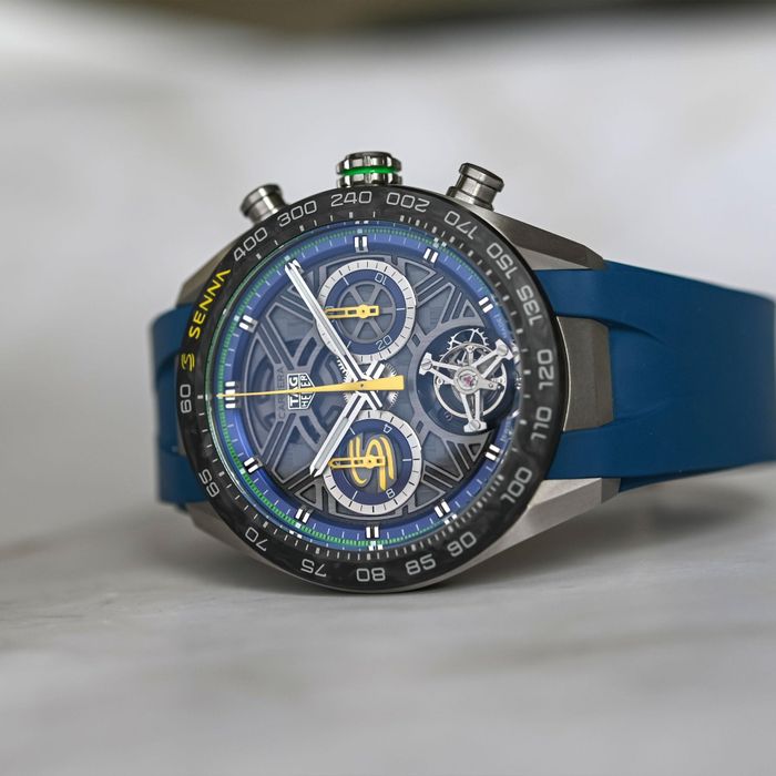 Trước thềm giải đua São Paulo Grand Prix 2024, TAG Heuer đã ra mắt chiếc Carrera phiên bản đặc biệt, dành riêng để tưởng nhớ Ayrton Senna, tay đua Công thức 1 huyền thoại 3 lần vô địch thế giới. Mẫu đồng hồ này ngay lập tức thu hút sự chú ý với thiết kế ấn tượng, lấy cảm hứng từ màu sắc trên mũ bảo hiểm của Senna. Bên trong lớp vỏ thép không gỉ 42 mm là bộ máy TH20-09 chronograph tourbillon. Mặc dù sở hữu thiết kế ấn tượng và ý nghĩa đặc biệt, nhiều người cho rằng mức giá 37.000 USD là quá cao so với bộ máy được trang bị. Cỗ máy được sản xuất giới hạn chỉ 500 chiếc và sẽ được bán từ tháng 11. Ảnh: Monochrome Watches.
