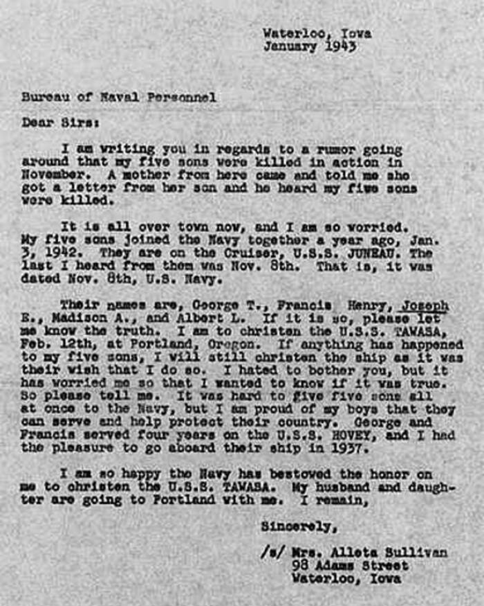 Thông tin về cái chết của 5 anh em nhà Sullivan mãi về sau mới truyền đến những người thân của họ tại quê nhà. Vào tháng 1/1943, bà Alleta đã viết một lá thư gửi hải quân Mỹ để cố gắng tìm hiểu thông tin về những người con trai của mình. Trong bức thư, bà cho biết muốn được xác nhận thêm thông tin về tin đồn 5 người con trai của minh đã tử trận trong trận chiến vào tháng 11/1942. Bà viết: “Một bà mẹ ở đây đã đến và nói với tôi rằng bà nhận được một lá thư từ con trai bà. Anh ấy nghe nói các con trai của tôi đã tử trận vào năm ngoái… Nếu đúng như vậy, xin hãy cho tôi biết sự thật… Tôi ghét phải làm phiền ông, nhưng điều đó khiến tôi lo lắng, muốn biết liệu điều đó có đúng không. Vì vậy, xin hãy cho tôi biết. Thật không dễ để 5 con trai của tôi vào hải quân cùng một lúc. Tôi tự hào về các con trai của mình vì chúng có thể phục vụ và giúp bảo vệ đất nước.”