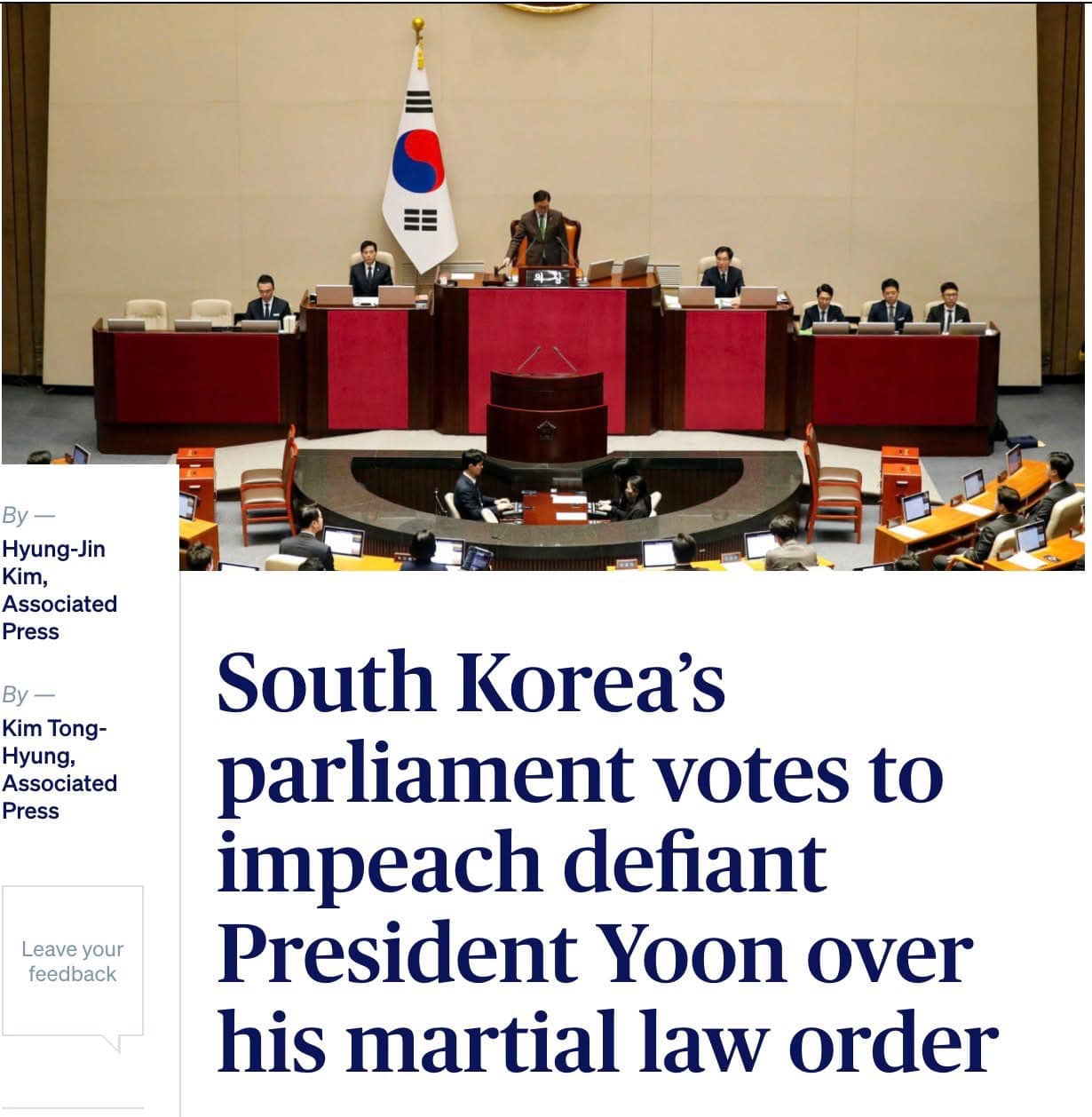 Hàng trăm nghìn người tụ tập gần tòa nhà quốc hội đã reo hò trong niềm hân hoan, vẫy biểu ngữ và vung những que phát sáng K-pop đầy màu sắc, trong khi một nhà hoạt động chính hét lên trên sân khấu, "Chúng tôi đã bảo vệ được trật tự hiến pháp!"