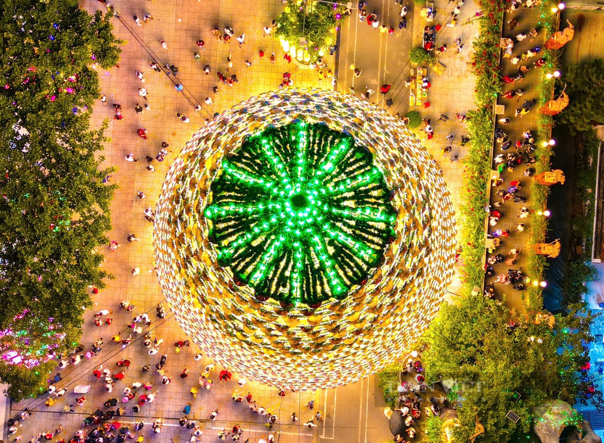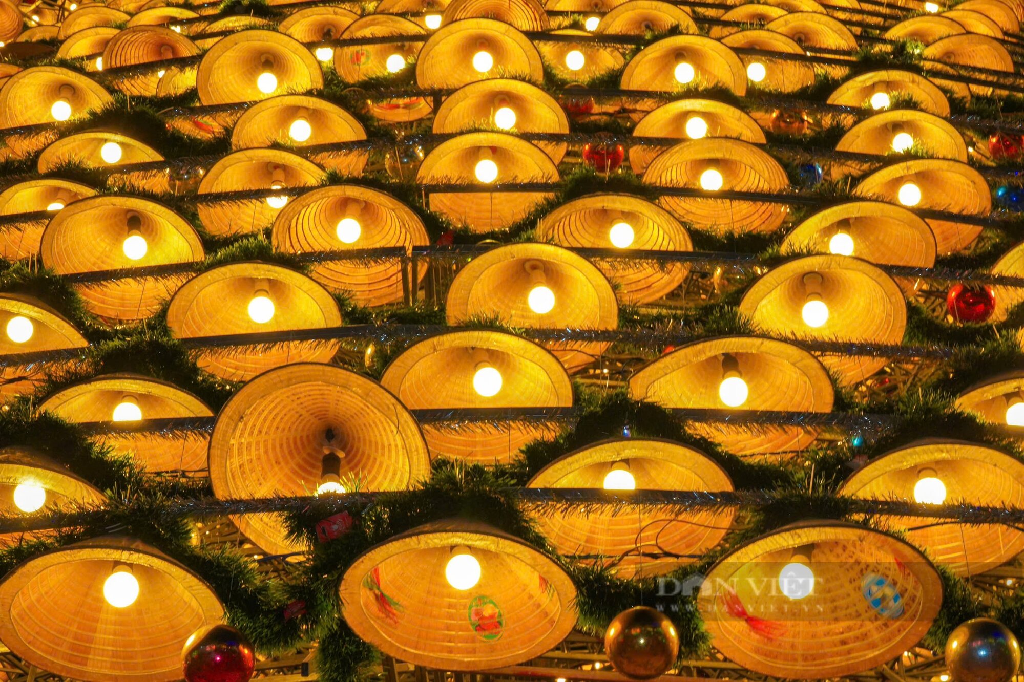 Những chiếc nón lá được xếp đặt khéo léo xung quanh bộ khung sắt nặng hàng tấn tạo thành hình cây thông Noel 4 tầng lung linh về đêm.